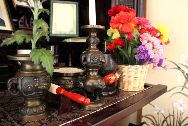 配置する場所は、香炉や燭台などを置く一番手前側、また